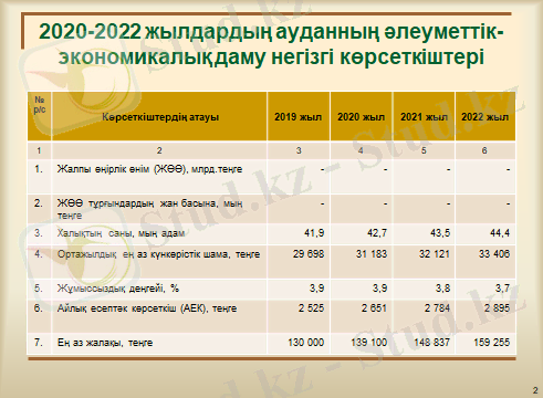 - ауданның әлеуметтік-экономикалық дамуының негізгі көрсеткіштері;