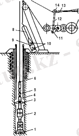Ұрмалы бұрғылау. Оның барлық түрлерінің ішінде ең көп тарағаны ұрмалы-арқанды бұрғылау. 1 Долоттан тұратын бұрғылау снаряды, 2 Ұру штангасы, 3 жылжымалы қайшылық штанга, 4 Арқанды құлып, 5Арқан, 6 тартпа ролик, 7бағыттайтын ролик.
