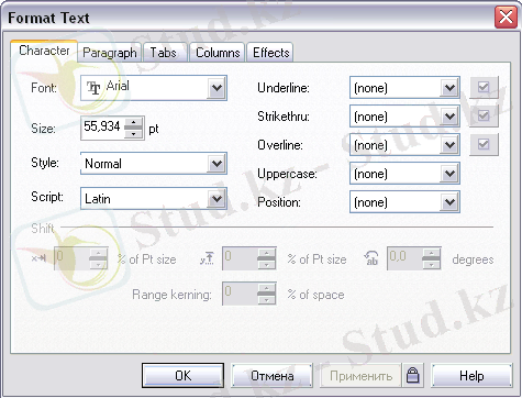 Параметрлерді нақты реттеу үшін пішімдеу батырмасын қолдана аламыз. Сол кезде Format Text (Мәтін пішімі) диалог терезесі шығады (13-сурет), онда бірнеше вкладка барлық тақырыптамалық пен блочный мәтіннің реттеу параметрлеріне кіру мүмкіндігі бар.