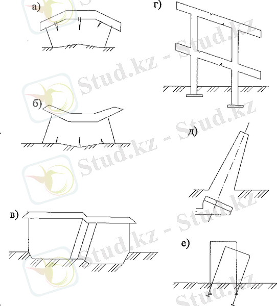 Сурет-1 Ғимараттар мен құрылымдардың негізін салғандағы деформация түрлері; а- бүгілу, б- майысу, в, г- қисаю, д, е-крен