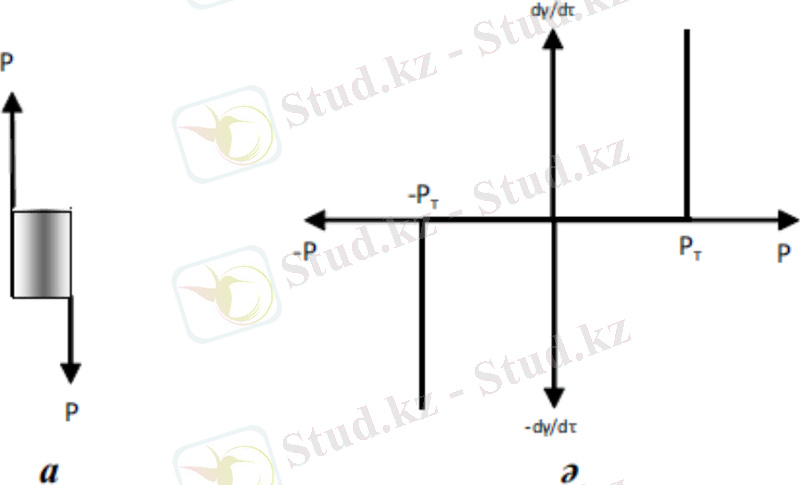 3-сурет. Идеал пластикалық Сен-Венан-Кулон денесiнiң үлгiсi (а) және осы дененiң деформациясының кернеуге тәуелділігі (ә)