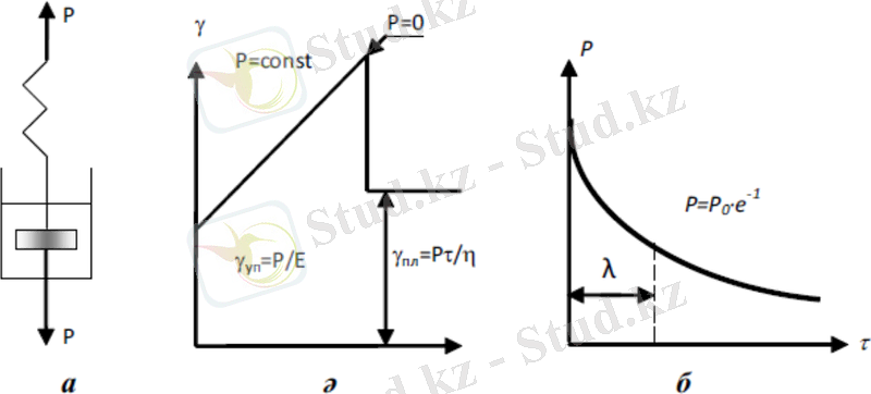 4-сурет. Серпiмдi тұтқыр Максвелл денесiнiң үлгісі (a), осы үлгінің деформациясының уакытқа тәуелдiлiгi (ə), кернеуiнiң релаксациясы (б)