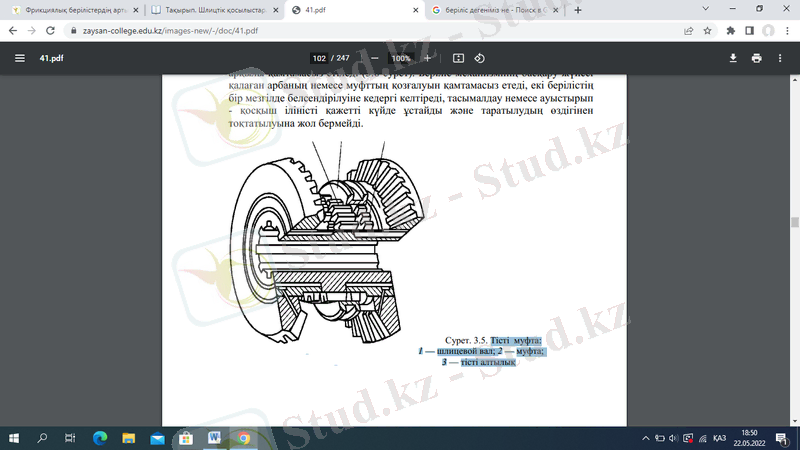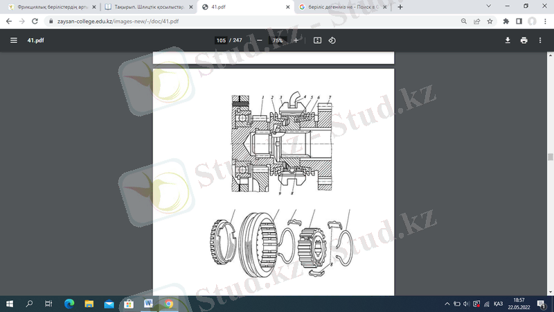 Синхронизатор 9- ступицы, 3 - муфты, 2 - құлыптау сақинасынан тұрады. Дөңгелек ілгегі қосымша білікке қосылады, ал сыртқы бетінде осьтердің ось бойымен жылжытатын шлицалар бар 3. Синхрондаушы екінші білікпен аралық білікпен тұрақты байланыста болған кезде екінші білікпен немесе алтылық 7 отырып, бастапқы білікке отыратын 1 немесе біріншіні қамтуға мүмкіндік береді. 1 жəне 7 - тістерде ілінген 3 муфтамен жəне конустық беті бар скобалармен жарқылдауға болатын тісті дөңгелектер бар.