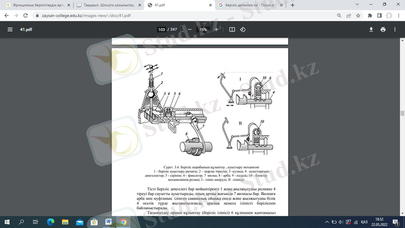 Беріліс қорабының құлыптау, ауыстыру механизмі 1 - беріліс ауыстыру рычагы; 2 - шарлы тіреуіш; 3 -кулиса; 4 -ауыстырғыш дөңгелектер; 5 - серіппе; 6 - фиксатор; 7 -вилка; 8 - арба; 9 - педаль; 10 - блоктау механизмінің роликі; I - ілініс өшірулі; II -ілінісуі