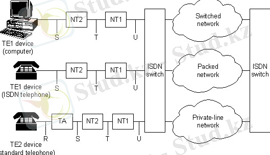 Integrated Services Digital Network (ISDN) желісінің атауы (интеграцияланған қызметтері бар сандық желі) соңғы пайдаланушылар үшін қол жетімді болатын сандық қызметтер жиынтығына жатады. ISDN дауысты, ақпаратты, мәтінді, графикалық бейнелерді, музыканы, бейнесигналдарды және басқа да материалдық көздерді қолда бар телефон сымдары бойынша пайдаланушыға жіберу және соңғы пайдаланушының бір терминалынан алу үшін телефон желісін цифрлауды көздейді. ISDN жақтастары әлемдік масштабтағы желінің суретін салады, көбінесе бүгінгі телефон желісіне ұқсас, онда цирк сигналын беру қолданылатынын және жаңа әр түрлі қызметтер пайда болуын қоспағанда. ISDN абоненттік қызметтерді, пайдаланушы/желі интерфейстерін және желілік және желіаралық мүмкіндіктерді стандарттауға әрекет болып табылады. Абоненттік қызметтерді стандарттау халықаралық ауқымдағы үйлесімділік деңгейін кепілдендіру әрекеті болып табылады. Интерфейсті стандарттау пайдаланушы / желі үшінші қатысушы тарап болып табылатын дайындаушылардың осы интерфейстерінің нарығында әзірленуін және өткізілуін ынталандырады. Желілік және желіаралық мүмкіндіктерді стандарттау ISDN желілерінің бір-бірімен байланыстарының жеңілдігін қамтамасыз ету жолымен әлемдік ауқымда бірігу мүмкіндігі туралы мақсатқа жетуге көмектеседі. ISDN қолданулары суреттерді өңдеудің жылдам әрекет ететін жүйелерін (мысалы, Group 1V факсимилі сияқты), қашықтықтан қол жеткізу индустриясына қызмет көрсетуге арналған үйлердегі қосымша телефон желілерін, жоғары жылдамдықты файлдарды беруді және бейне конференцияларды өткізуді қамтиды. Дауысты беру ISDN үшін танымал қолданбалы бағдарлама болады. Көптеген коммерциялық байланыс желілері ISDN-ді тарифтік бағадан төмен бағамен ұсына бастайды. Солтүстік Америкада жергілікті желілер коммутаторымен (local-exchange carrier) (LEC) коммерциялық байланыс желілері ISDN қызметтерін Т1 қосылыстарына балама ретінде қамтамасыз ете бастады, олар қазіргі уақытта "ғаламдық телефон қызметі" (WATS) (wide-area telephone service) қызметтерінің көп бөлігін орындайды. ISDN компоненттерінің қатарына терминалдар, терминалдық адаптерлер (ТА), Желі жұмысын аяқтау құрылғылары, желі жұмысын аяқтау жабдығы және коммутацияны аяқтау жабдығы кіреді. ISDN терминалдарының екі түрі бар. ISDN мамандандырылған терминалдары "1 типті терминалдық жабдық" (terminal equipment type 1) (TE1) деп аталады. ISDN стандарттарынан бұрын пайда болған DTE сияқты ISDN үшін дамымаған терминалдар "2 типті терминалдық жабдық" (terminal equipment type 2) (TE2) деп аталады. ТЕ1 терминалдары ISDN желісіне төрт бұралған сым жұптарынан тұратын сандық байланыс желісі арқылы қосылады. ТЕ2 терминалдары ISDN желісіне терминалдық адаптер арқылы қосылады. ISDN терминалдық адаптері (ТА) дербес құрылғы немесе Т Е 2 ішіндегі төлем болуы мүмкін. Егер 2 дербес құрылғы ретінде іске асырылса, онда ол ТА-ға физикалық деңгейдің стандартты интерфейсі арқылы қосылады (мысалы, EIA232, V. 24 немесе V. 35) . ТЕ1 және ТЕ2 құрылғыларынан тыс орналасқан ISDN желісіндегі келесі байланыс нүктесі NT1 немесе NT2 болып табылады. Бұл екі сымды жергілікті желінің дәстүрлі контурына төрт сымды абоненттік монтажды қосатын Желі жұмысын аяқтау құрылғысы. Солтүстік Америкада NT1 "Тапсырыс берушінің посылкалары жабдығының" (customer premises equipment) (CPE) құрылғысы болып табылады. Nt1 жарығының көптеген басқа бөліктері коммерциялық байланыс желілерімен қамтамасыз етілге