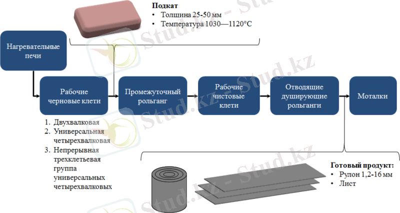 Үздіксіз кең жолақты стан 1700 жолақтарды ыстықтай таптау үшін дәстүрлі болып табылады, ол қалыңдығы 1, 5-16, 0 мм және ені 750-1650 мм қалыңдығы 300 мм дейінгі құйма слябалардан табақты және рулонды таптай алуға мүмкіндік береді. ҮКЖС-1700 типтік сұлбасы 2. 1 - суретте көрсетілген. Слябаларды өндіру кезінде пеште 1200-1250°С дейін қыздырылады, одан әрі рольганг бойынша станның қара тобына тасымалданады. Таптаудан кейін алғашқы екі қара клеттерде жаю 25-50 мм қалыңдығына дейін үздіксіз үш клетті топқа түседі. Таза топтың алдында таптаудың алдыңғы және артқы ұштарын кесу үшін ұшпалы қайшылар орнатылған, бұл таптауды ұстап алу және тұрақтандыру кезінде динамикалық жүктемені азайтады. Алдыңғы ұшын кескеннен кейін жаюды таза қабыршақты сынғышқа жібереді. Бұдан әрі металды таза топта соңғы қалыңдыққа дейін таптайды. Жолақтардың соңғы геометриясын станның соңғы клеткасында орналасқан байланыссыз өлшеуіштермен өлшейді. Жолақтар үздіксіз таза топтан шыққаннан кейін оны бұрушы рольганг бойынша моталкаларға апарады. Бұрғыш рольгангте суыту жүйесі орналасқан, ол жолақтың температурасын 200-250°С төмендетеді.