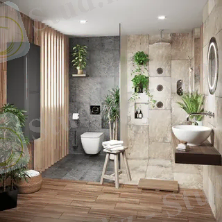 Жуынатын бөлмеде қабырғаларды безендіру үшін ағашты пайдалану қиын, себебі материал ылғалдылықтың өзгеруіне жол бермейді. Дизайнерлер қабырғаларды плиткамен безендіруді жақсы көреді. Эко-стиль күңгірт беттермен сипатталады, сондықтан жылтыр опциялар жұмыс істемейді. Тастың өрескел құрылымын имитациялайтын плитка керемет көрінеді. Көптеген адамдар декорға теңіз тақырыбын қосуға тырысып қателеседі. Теңіз де табиғаттың бір бөлігі, бірақ бұл дизайн экостильге сәйкес келмейді.