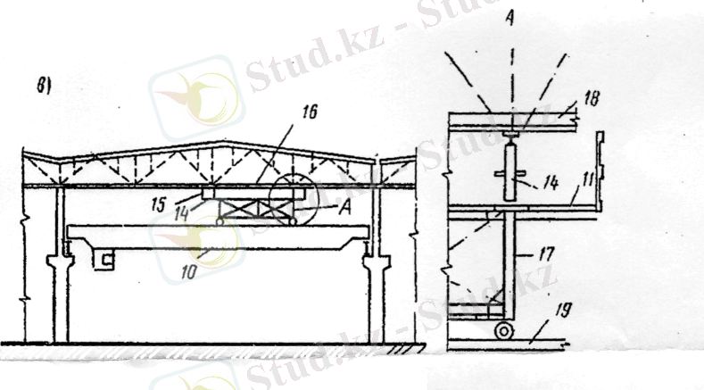 в - көпірлі кранды пайдалану арқылы; 10-Электр көпірлі кран; 11-жұмыс төсемі; 12-аспалы кран - Арқалық; 13-инвентарлық жылжымалы тіреуіштер; 14-кергіш домкрат; 15-жиналмалы қоршау; 16-жөндеуге немесе жоюға жататын элемент; 17-тірек алаңы; 18 -итарқа фермасының төменгі белдеуі; 19 - электр көпірлі Кранның жүк арбасының жолдары.