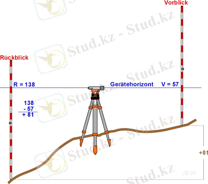 Содан кейін А және В нүктелерінде түрған рейкаларға кезекпен қарап, дүрбінің визир сіулесінің осы нүктелерден биіктіктері ″а″ және ″b″есептелініп алынады. Егерде А нүктесін артқы, ал В нүктесін алдыңғы деп белгілесек, онда ″а″ рейкадан алынған артқы есеп, ″е″ -алдыңғы есеп болады. Содан В нүктесін А нүктесіне қарағандағы биіктігінің айырмашылығы былайша анықталады: