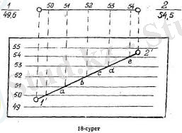 Интерполяциялау екі нүктенің белгілі биіктіктері арқылы оның қима биіктігіне сәйкес аралық мәндерін анықтау. Интерполяциялау үшін мөлдір қағаз (калька) қолданылады. Калькаға аралары бір-біріне тең параллель сызықтар жүргізіліп (73-суретте), әр сызыққа қима биіктігіне сәйкес сандар жазылады.