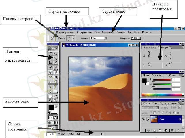 Сурет 1. Adobe Photoshop бағдарламасының интерфейсі