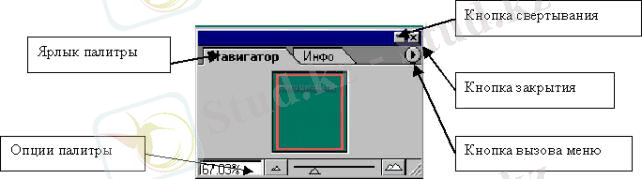 Палитра - бейнеге түрлі операцияларды қолдануға арналған көмекші терезелер. Палитралар, әдетте оң жақ бойымен 4 панельде вертикальды орналасқан. әр панельде тек бір палитра ғана көрінеді. Белсенді палитраның түбіршегі ашық түспен белгіленген. Басқа терезелер сияқты, панельдерді басқа жерге орналастыруға болады. Егер де қандай да бір панель керексіз болса, оны жабуға немесе орауға болады. Стрелка тәрізді батырманы шерткенде берілген палитраның командалар менюі ашылады. Бұл командалардың көмегімен палитралар опциясын басқаруға болады. Бірінші панельде навигатор және инфо палитралары орналасқан. Олар бейненің масштабын өзгертуге арналған, сонымен қатар таңдалған құралдардың параметрі жайында ақпарат сақталған.