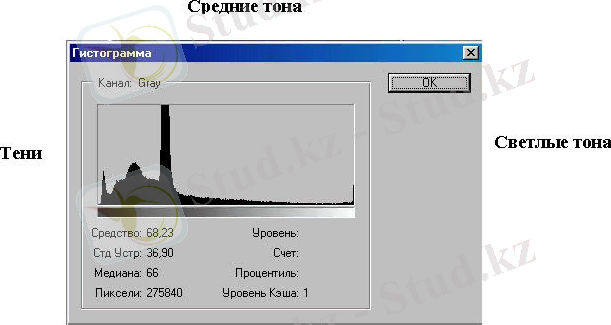 Көлденең осьте жарықтың мәні орналасқан: о- ден 255- ке дейін, ал тік ось бойынша әрбір жарық деңгей пикселінің мөлшері көрсетіледі.