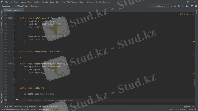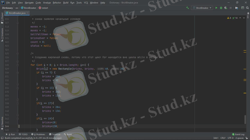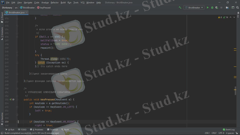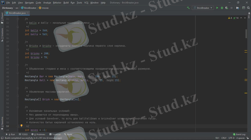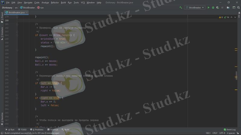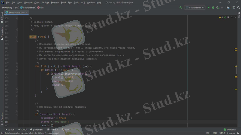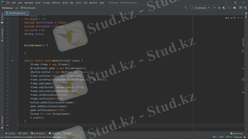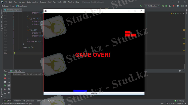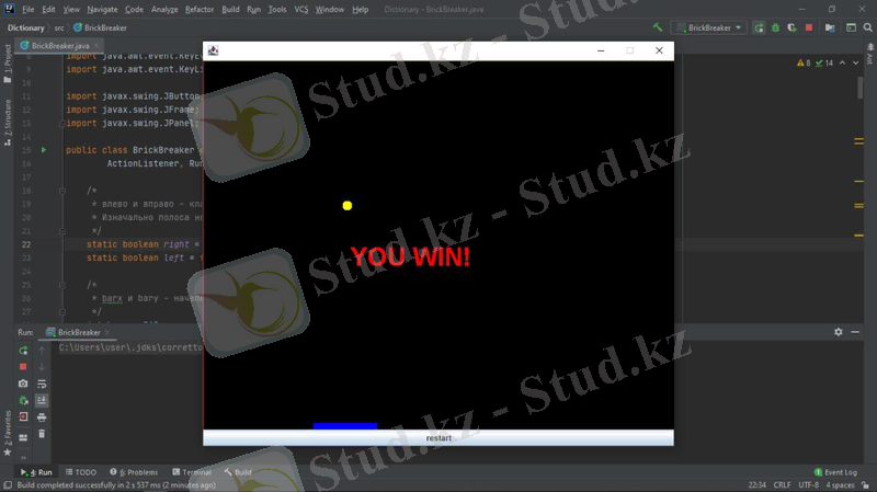 Жобада мына құрылымдар қарастырылады: компьютерлік қозғалыс стратегиясын орындау алгоритмі, файлдармен жұмыс, объектіге бағытталған бағдарламалау. Барлық элементтер Java тілінде, Intellij IDEA community edition қосымшасында қарастырылады. Тапсырманы орындау өз білімдерін бағдарламалау тілін меңгеру бөлігінде де, күрделі алгоритмдерді құру және іске асыру бөлігінде де жан-жақты қолдануды талап етеді. Осы жұмыста сипатталған "Brick breaker" ойыны - қолдануғa дайын толық бағдарламалық өнім. Ол пайдаланушы үшін қол жетімді, түсінікті және көрнекі интерфейске ие. Java - программисттердің арасында кең таралған, танымал объектіге бағытталған бағдарламалау тілдердің бірі. Java бағдарламалау тілі бұл Internet желісінде жұмыс істейтін Java тілі объектілі-бағытталған, платформалы - тәуелсіз, желі ішінде жұмыс істейтін тармақталған қосымшалардың өңдеуіне қолданылатын программалау тілі. Java шынымен де желілік ортада құнды құрал болып табылады. Бірақ ол тек онымен шектеліп қоймайды. Java тілі әртүрлі бағдарлама жасау үшін қолданылатын универсалды тіл. Оған қоса Java платформаға тәуелсіз проектер жасау үшін қолданылады. Бағдарлаудың қарапайымдылығы және қауіпсіздік амалдары тез және түсінікті код жазуға мүмкіндік береді.