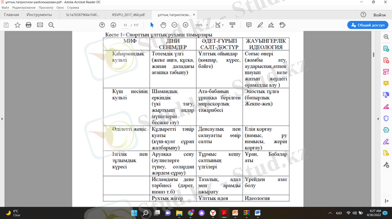 1-кесте - Спорттың ұлттық рухани тамырлары