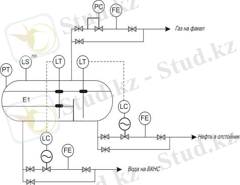 Бөлу процесінің жеңілдетілген функциясы суретте көрсетілген. Оған мыналар кіреді: Е1-суды ағызатын мұнай және газ сепараторы, FE-газды тұтыну датчигі, CMR басқару клапаны бар LC-mepc типті желілік жетек, LS-апаттық деңгейдегі дабыл, LT-деңгей өлшегіш (1 және 2 бөліктердегі май деңгейі және фазалық бөлу деңгейі), PC-тікелей әрекет ететін қысым реттегіші, PT-қысым датчигі. Мұнай-газ қоспасы коллектордан МГС -ға құбыр арқылы түседі. Сұйықтықтан бөлінген Газ тікелей қысым реттегіші мен Шығыс өлшегіші арқылы өз қысымымен газ құбырына түседі, содан кейін ол газ өңдеу зауытына тасымалданады.