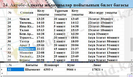 1. Пойыздың бағытын(Ақтөбе-Ақтау) және жүру мерзімін(24 наурыз) кестеден көре аламыз.