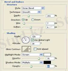 Дайындамаға қабаттың Bevel and Emboss (Скос және рельеф) стилін қолданайық: Layer → Layer Style → Bevel and Emboss (Қабат → Қабат стилі → Скос және рельеф) . Оның баптаулары 4-суретте көрсетілген. Осы әрекеттің нәтижесі 5-суретте көрсетілген.