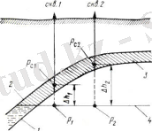 ұңғыдағы түптің әртүрлі гипсометриялық белгілері және келтіру жазықтықтары. Егер мұнайлы-су қатынас ∆Ζ -ке көтерілсе, ал келтірілген жазықтық өзгермей қалса, онда 1 және 2 ұңғыда келтірілген қысым мынаған тең: