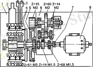 Электроқозғалтқыштан бұрма үшкіріне қозғалыс қатты берілмейді, ол электроқозғалтқышты қауіпті жүктемеден және итерулерден сақтандыратын тізбектеу үйкелісін фрикциалайды. Фрикциаланған барабан 7 мен шестерня 5 валға тығыздалған, ол шестерня 6 еркін барады. Осы валда барабан ішінде үш шпонкалы муфта қатты нығыздалған, мұндай шпонкалар 7 барабанның ішкі жағында да бар.