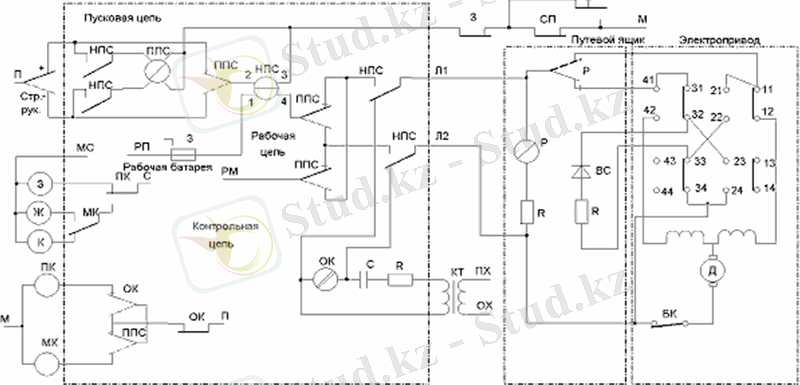 1-суретте бағыттағыштық электржетекті басқарудың екі сымды сұлбасы көрсетілген. Р реверсирлеуші реле жол жәшігінде ПЯ орналасады. Қалған релелер ЭО постында орналасады. ЭО посты мен жол жәшігі өзара Л1 және Л2 сымдарымен жалғанған. Жол жәшігі бағыттағыш электржетекпен бес сым арқылы жалғанған. Суретте көрсетілген бағыттағыш плюс күйінде орналасқан.