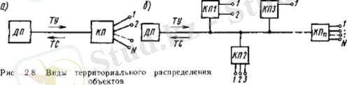 Қашықтықтағы нысандарды диспетчерлік пункттен ДП оператор басқарады. Диспетчерлік пунктте қабылдау-жіберу аппаратурасының диспетчерлік жартылай кешені орналасады және басқарылатын немесе бақыланатын нысандар жанында бақыланатын пункттің БП жартылай кешені орналасады. Басқарылатын немесе бақыланатын нысандарды бір аймақта орналастырады - жинақталған нысандар (1-сурет а ) немесе бір бірінен белгілі бір қашықтыққа іші топтармен таратып орналастырады - таратылған нысандар (1-сурет б) . Жинақталған нысандар кезінде барлық нысандарға жалпы ортақ БП жартылай кешенін орнатады, ал таратылған нысандар кезінде әрбірінің жанына жеке аппаратура жартылай кешенін орнатады.