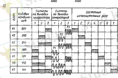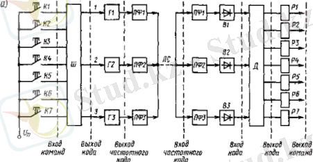 Кодтық таңдау кезінде әрбір команда білгілі бір кодтық комбинациямен жіберіледі. Командаларды жіберу үшін кез келген код алынады. Кодтық таңдауы бар жүйенің жіберу соңында шифратор орнатылады, ал қабылдау соңында дешифратор болады. Басқару батырмасының бірін басқан кезде (2-сурет а, б) сигнал шифраторға түседі, ол сигналды белгілі бір код комбинациясына түрлендіреді. Байланыс жолағы (ЛС) арқылы ол комбинация қабылдау жартылай кешенінің сүзгісіне ПФ түседі, ол жиіліктік импульстер шығарады. Олардың шығысындағы сигналдар түзеткіштермен (В1, В2, В3) түзетіледі және импульс комбинациясының коды түрінде дешифраторға Д түседі, ол кіріс импульстерінің бекітілген комбинациясы кезінде бір ғана атқарушы реленің (Р1, Р2, . . . Р7) қоздырылуын қамтамасыз етеді.