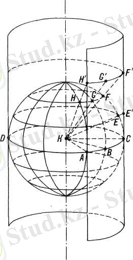 Цилиндрлік проекциялар . Цилиндрлік проекцияларды құрған кезде қиылысу нүктелері алынады, яғни градустық тордың сызықтарын глобустың жазықтығында жобалайды цилиндрдің сыртқы жазықтығында, глобустың осімен сәйкес келетін, ал екі дененің диаметрі тең (сурет 2) . Қосымша жазықтық ретінде цилиндрді қолданғанда алады, экватордың қиылысу нүктелері - A, B, C, D және басқалар бірге глобуста берілген және цилиндрде. Ал басқа қиылысу нүктелері глобустан цилиндрдің жазықтығына көшіріледі. Сонда, Е және F нүктелері, бір меридианда орналасқан. С нүктесімен, көшіріледі Е / және F / нүктелеріне. Сонымен қатар ол цилиндрде түзу, экватордың перпендикуляр нүктесінде орналасқан. Бұл осы проекцияда меридиан пішінін анықтайды. Цилиндр жазықтығына параллель дөңгелек пішіндес жобаланады, экваторды параллель сызықтарына (мысалы, параллель, Е / және F / нүктесі орналасқан) .
