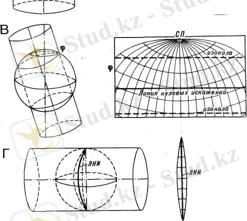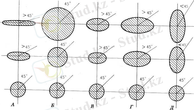 Бұрмалану эллипсінің түрі проекцияларда: тең шамалы - А, тең бұрышты - Б, еркін - В, сонымен қатар меридиан бойынша тең аралықты - Г және параллель бойынша тең аралықты - Д. Схемада бұрмалану бұрышы 45 0 көрсетілген.