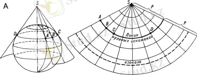 Поликонустық проекциялар. Поликонустық проекцияларда торлардың құрылуы глобустың градустық торының учаскесін жобалау жазықтықта бірнеше жанама конустарда және конустың жазықтығында пайда болған сызықтардың жазықтыққа ауысуы арқылы көрсетуге болады. Бұл тәсілдің жобалауының жалпы мәні 5-ші суретте көрсетілген, А конустың төбесі көрсетілген. Әрбіреуіне глобустың жазықтығына ендік учаскесін жобалайды, сәйкес келетін конустың жанасу параллельіне сәйкес келетін. Конусты жазғаннан кейін учаскелер көрінісін алады жазықтықтыағы сызық түрінде, сызықтар картаның орта меридианыбойынша бір- біріне қосылады. Тордың ақырғы түрін алады, сызықтардың арасынан бөлінуі арқылы созылу нәтижесінде.