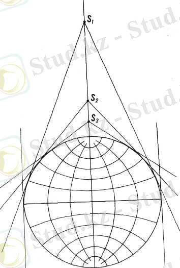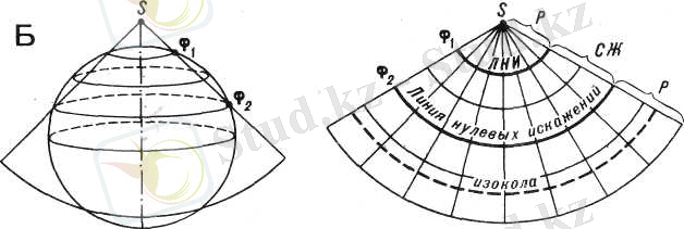 Конустық проекциялар . Конустық проекцияларда картографиялық торларды құру үшін нормальді конустарды пайдаланады - жанама немесе қиылысатын.