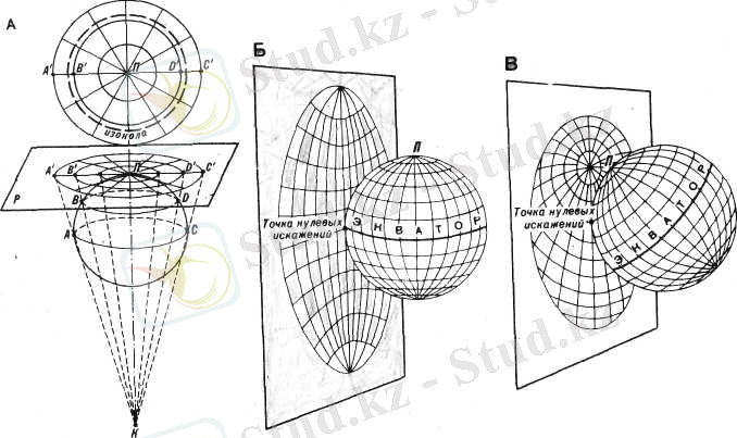 Азимуталдық проекциялар. Азимуталдық картографиялық торлар дегеніміз, сонда алынатын глобустың градустық торын жанама жазықтыққа жобалау арқылы (сурет) . Нормальді азимуталды торды жазықтыққа көшірген кезде алады, полюс бойында глобусқа тигізіліп тұрады. (сурет 4А), көлденең - экватор бойында жазықтықты жанайтын (сурет 4Б) және қисық - алынған жазықтыққа көшірген кезде (сурет 4В) . Торлардың сыртқы пішіні 4-ші суретте жақсы көрсетілген.