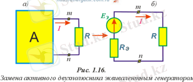 Белсенді биполярлық генератор сияқты әрекет етеді. Оның ішіндегі өтелмеген көздер сыртқы тізбекке энергия береді (сурет. 1. 16, а) . ЭҚК EE және ішкі re кедергісі бар энергия көзін алуға тырысуға болады, ол екі терминалға тең болады, яғни сыртқы тізбекте бірдей ток жасайды (сурет. 1. 16, б) .