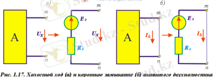 Алынған генератор кез-келген режимде, оның ішінде бос және қысқа тұйықталу режимдерінде екі терминалға тең болуы керек. Белсенді Қос полюсті құрайтын энергия көздері бос режимде оның қысқыштарында UX кернеуін тудырады (сурет. 1. 17, а), ал қысқа тұйықталу IK тогын тудырады (сурет. 1. 17, б)