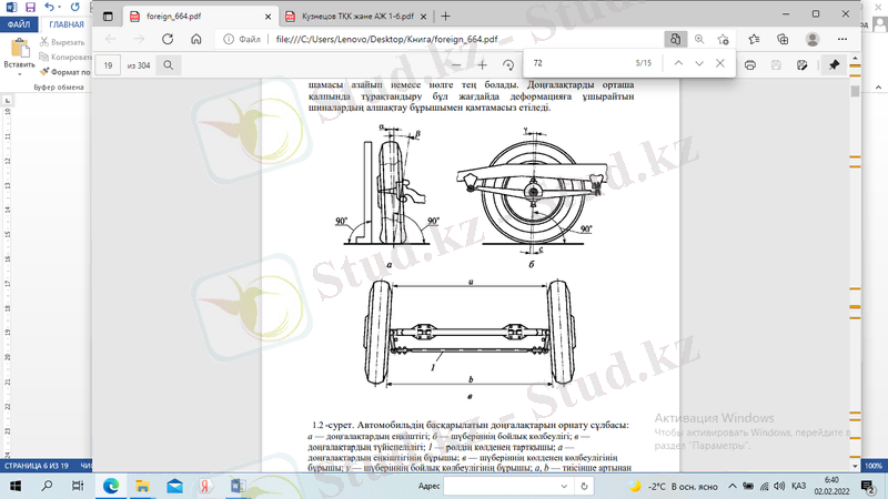 Шүберіннің көлденеңінен еңкеюіне алдыңғы осьті тиісті формаға келтіру арқылы қол жеткізіледі. Шүберіннің немесе бұрмалы бағананың көлденеңінен еңкею бұрышы 6 . . . 8°-ге тең. Шүберіннің немесе бұрмалы бағана осінің бойлық көлбеулігі (2-сурет, б) сондай-ақ доңғалақтардың орташа қалпында басқарылатын орнықтылығын арттырады. Шүберіннің (бұрмалы бағананың) мұндай көлбеулігі әсерінен шүберін осінің жалғамасы доңғалақтың жолмен беттесу нүктесінен с қашықтықтағы жол жазықтығымен қиылысады.
