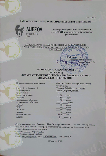 Өсімдіктер физиологиясының арнайы практикумы: оқу-әдістемелік бағдарлама