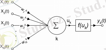 {𝑥1(𝑡), …, 𝑥𝑁(𝑡) } кіріс векторлары беріледі, ал ол 𝑤𝑘 = {𝑤1𝑘, 𝑤2𝑘, …, 𝑤𝑁𝑘} сенімді өлшемдік векторға көбейтіледі немесе басқаша айтқанда, 𝑥𝑖(𝑡) векторларының коэфициентері 𝑤𝑁𝑘 сенімді коэфициенттерімен өлшенеді, ол төмендегі формулаға сәйкес туындайды: