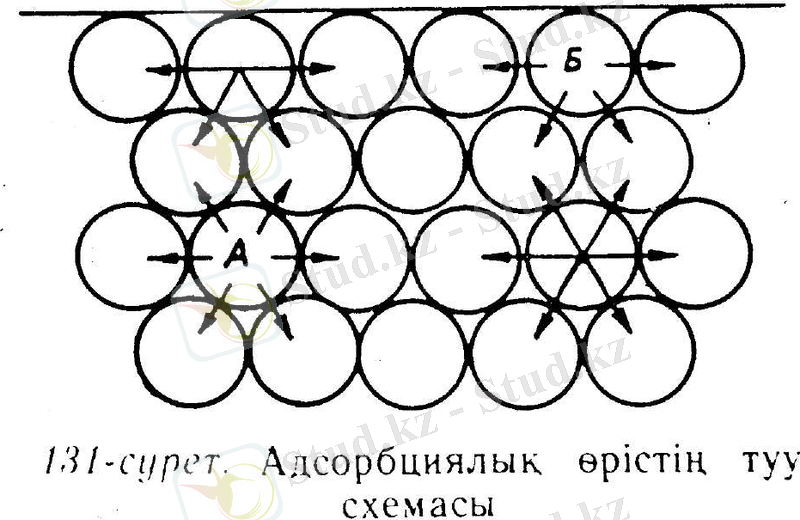 әрбір қатты заттың бөлшектері ( молекула, атом, ион) белгілі тәртіппен рналасатындығын білеміз. заттың сыртқы беткісіндегі бөлшектері ішкі қабатындағы бөлшектерден басқа жағдайда болады. ішкі бөлшектегі (а) басқа бөлшектер жан-жағынан бірдей қоршап тұр. ол бөлшектің басқа бөлшектерді өзіне тарту күші көрші сондай күшімен кездесіп бірін-бірі теңестіреді. ал сыртқы қабаттағы бөлшектің(б) сыртқы бет жағында көрші бөлшектер жоқ болғандықтан, оның тарту күшінің бірсыпырысы бос тұр. әрбір заттың сыртқы бетінде бос тұрған тарту күші тұрады, міне сол күш адсорбциялық өріс туғызады, сондықтан сыртқы бетке жанасқан газ, бу және еріген заттың бөлшектері оған тартылып адсорбцияланады. адсорбциялық өрістің күші ад-шы