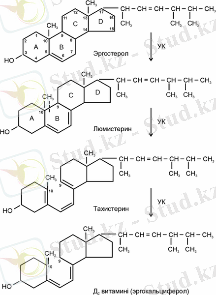 Д2 витамині ультракүлгін сәулесінің әсерімен эргостеролдан бірнеше аралық заттар (люмистерин, тахистерин) түзілу арқылы пайда болады. Қазіргі кезде бұл реакцияның барлық өнімдері таза күйінде бөлініп алынған.