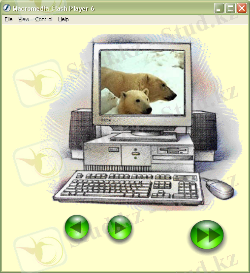 Суреттерді ауыстыру программасын Flash редакторының 6-шы нұсқасында дайындап шықтым. Бұл программаның орындалу барысында компьютер және үш перне бейнеленген. Осы пернелерді басу арқылы келесі суретке өтуге болады. Бұл жұмысты жасау барысында маска деп аталатын құралды пайдаландым.