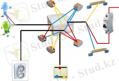 Балқымалы қорғағыштар, автоматты ажыратып-қосқыштар. Өткізгіштерді жалғастыру. Электр таратушы қорапты ( коробка) пайдаланып, электр желісінің схемасын сызу, желі тарту.