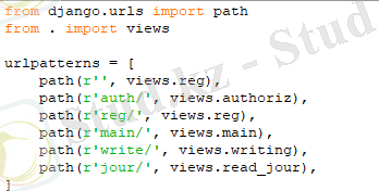 Django URL мекенжайлары мен көріністерге сәйкес келеді. URL мекенжайы тырнақшалармен бөлінген тұрақты өрнектер арқылы жазылады. Егер оларда ештеңе болмаса, онда мекен-жай қабылданадыhttp://127. 0. 0. 1:8000.