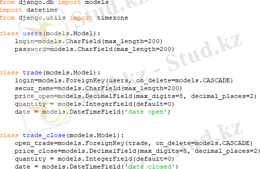 Екіншісі - сауда - ашық сауда-саттық тізімі. Шетелдік кілт болып табылатын авторизацияланған пайдаланушының нөмірін қамтиды. Пайдаланушы жүйеден жойылғанда, онымен байланысты барлық ашық мәмілелер жойылады (on_delete = models. CASCADE параметріне байланысты) . Сондай-ақ, бұл кестеде акцияның атауы, мәміле ашылған баға, акциялар саны және уақыты көрсетілген күні болады.