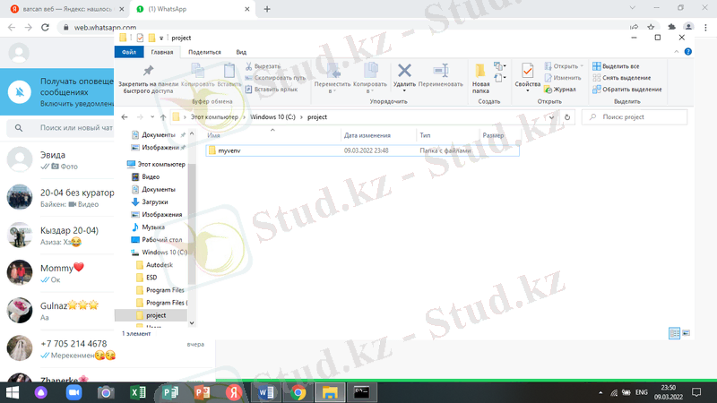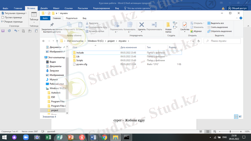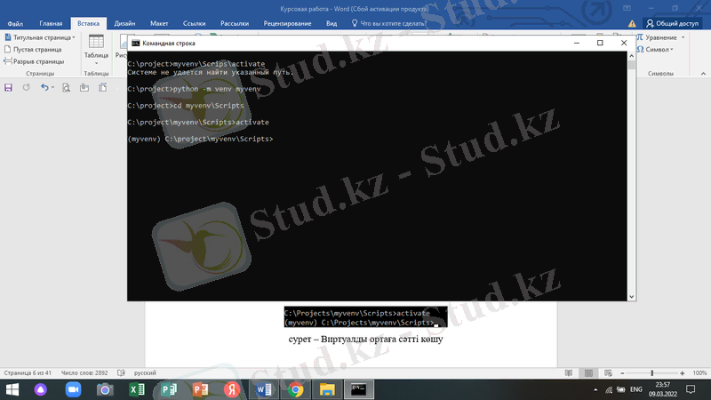 Енді пәрмен жолын пайдаланып myvenv/Scripts қалтасына өтіп, белсендіру файлын орындаймыз - осылайша виртуалды ортаны ағымдағы сеансқа қосамыз.