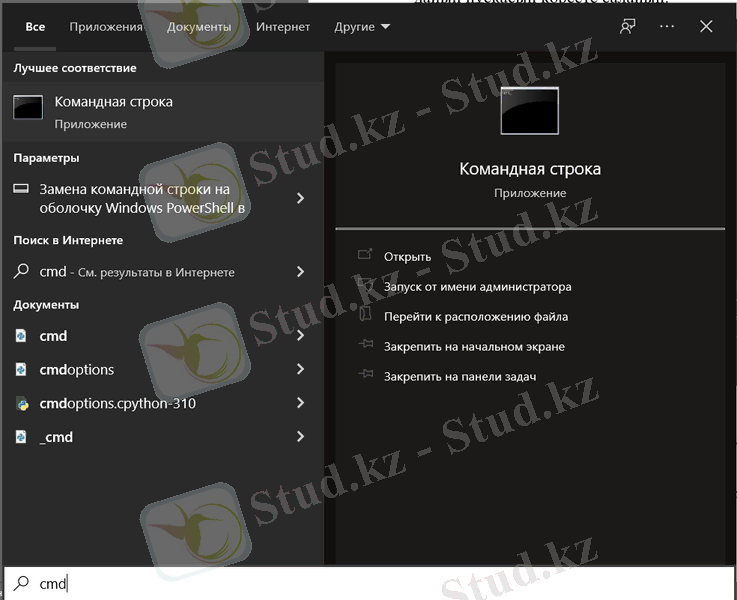 Ол үшін пуск батырмасын басып поискқа cmd командасымен консоль ашамыз. (9-сурет)