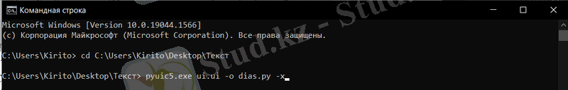 Барлығы еш қатесіз жазылғанын тексеру үшін консольға осы программаны команданы жазамыз pyuic5.