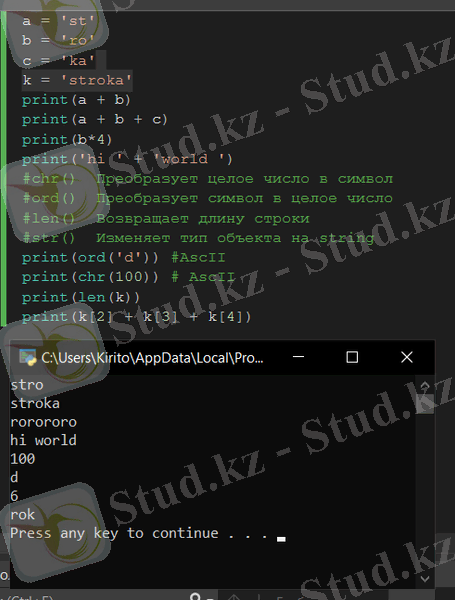 Жолдардың түрлері және символдардың типі болады. Әр жолға әртүрлі командалар қолданса болады. Көрсетіліп тұрған кодта мен chr(), ord(), len() осы жолға арналған бірнеше командаларды қолдандым. Әр команда белгілі бір функция атқарады