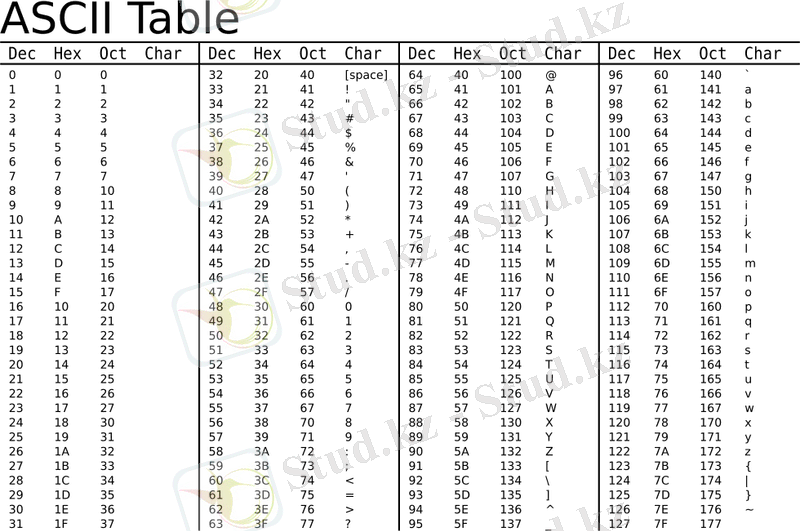 Бұл ол командалар AһscII кодирование негізінде жасалады кестеден қарап кодта шыққан нәтижемен салыстырсаңыз болат.
