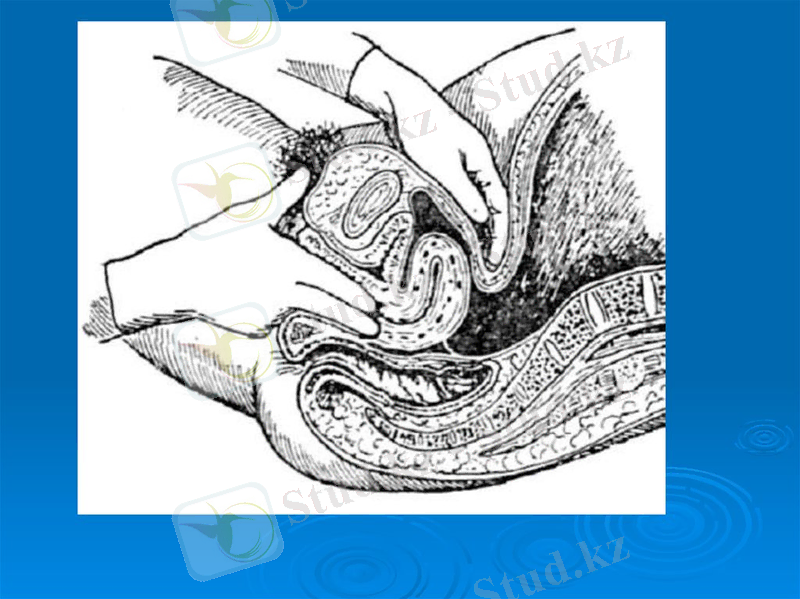 9. Сауақтарды жатыр мойнының астына енгізе отырып, сол қолды құрсақ үстіне орналастырып саусағымен жатырды басып тексеріңіз.