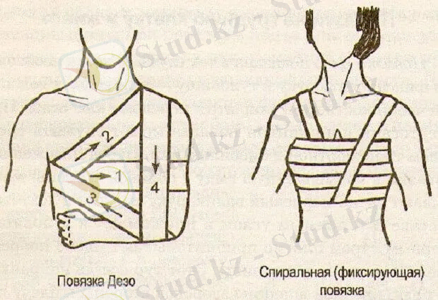 Дезо таңғышы- ол бұғана, иық сүйегі сынғанда және иық буынын салғанда, олардың кеудеге қысып ұстатып қозғалтпау үшін салынады. Қолды шынтақ буынында 90° иіп, білекті кеудеге қысып тұрады. Зақымдалған жақтағы қолтық астына мақтадан жасалған жастық қойылады. Бірінші айналымы жолмен зақымдалған оң иық сүйегі кеудеге таңылады. Бинтті орау солдан, оңға қарай басталады. Екінші орам қарсы қолтық астынан, ауру қолдың иығының үстіне қарай тартылып, иық үстімен төмен қарай арқасы арқылы өтіп, тік түсіп, шынтақ буынды басып, білекті денеге қарай қысып ұстайды да, бинтті қиғаш бағытпен сау жақ қолтық астымен арқасына қарай өтіп, зақымдалған иық үстімен төмен түсіп білектін ортасымен артына қарай өтіп, сау жақ қолтық астына қарай қиғаш бағытталады да, екінші орамының жолмен қайталанады. Бинтті орау таңылған қол толық, берік ұсталғанша орындайды. Вельпо таңғышы- зақымдалған қолдың саусақтарын сау иықтың үстіне қояды. Ирек таңғыш ережесімен ауру қолды ұстатады, содан сон бинтті сау қолтық пен арқасы арқылы қиғаш бағытпен зақымдалған иық үстімен тік төмен иық сүйек арқылы шынтақты іліп, көлденең бағытта кеудені айналдыра қолды қайталап ұстатады.